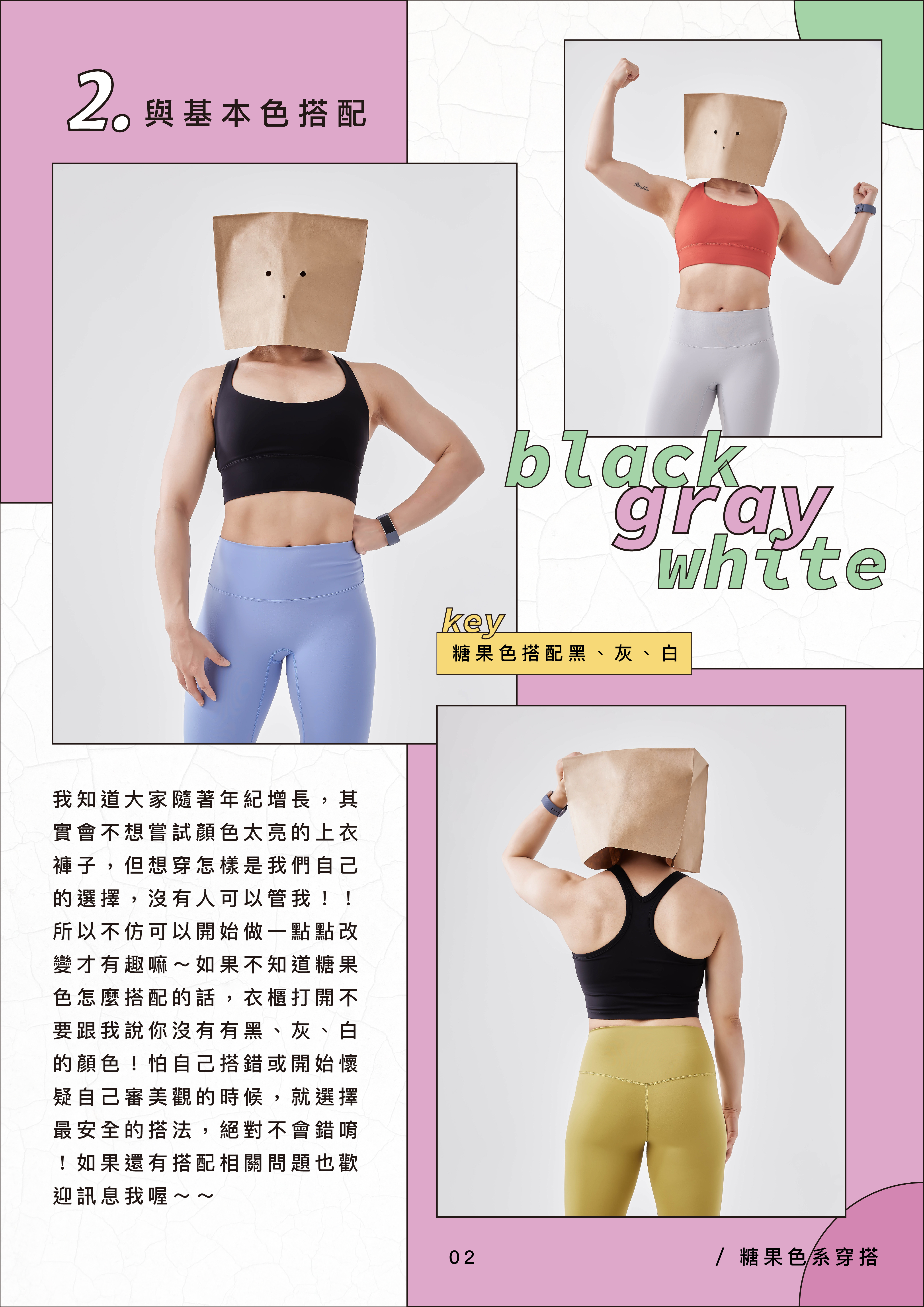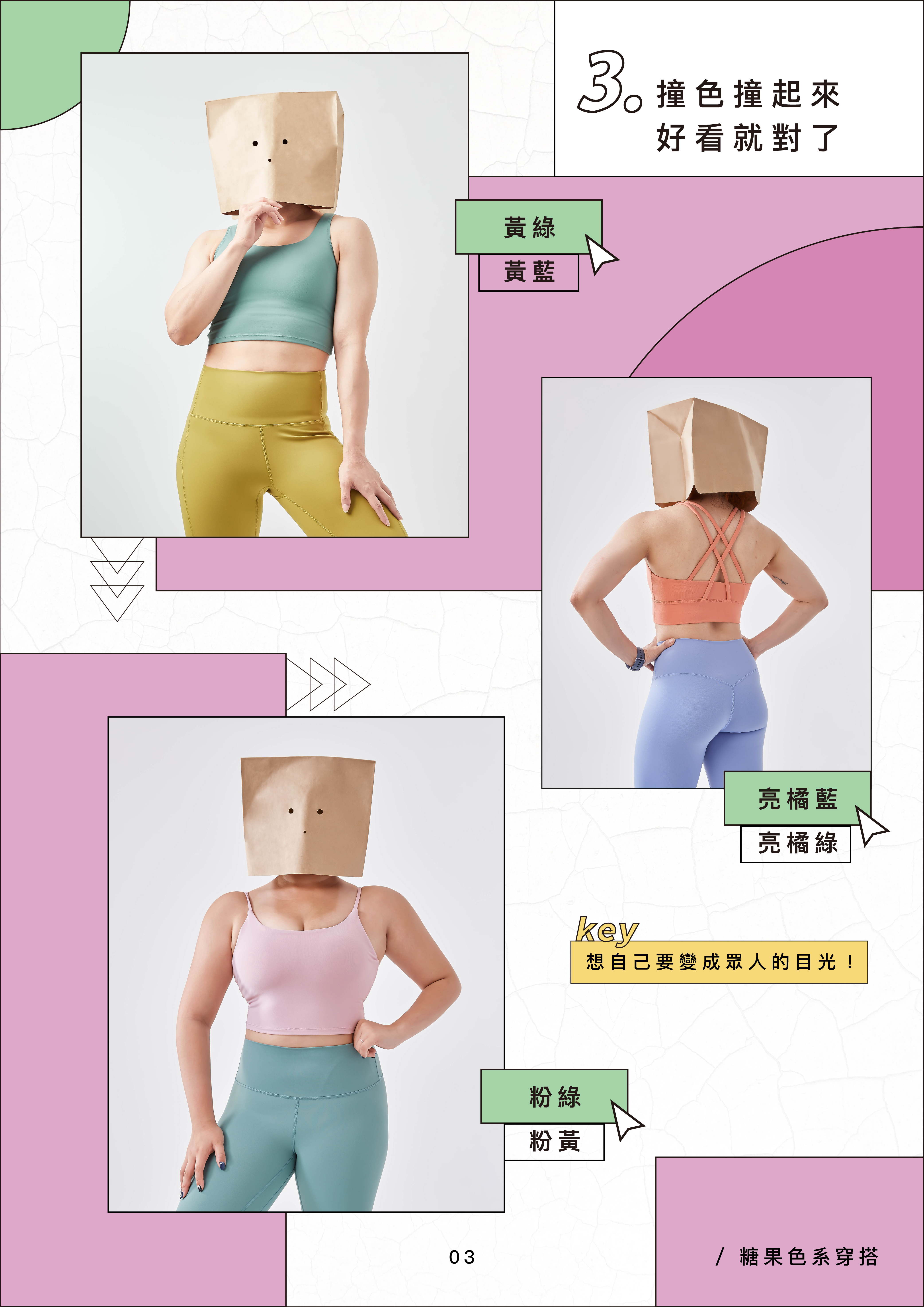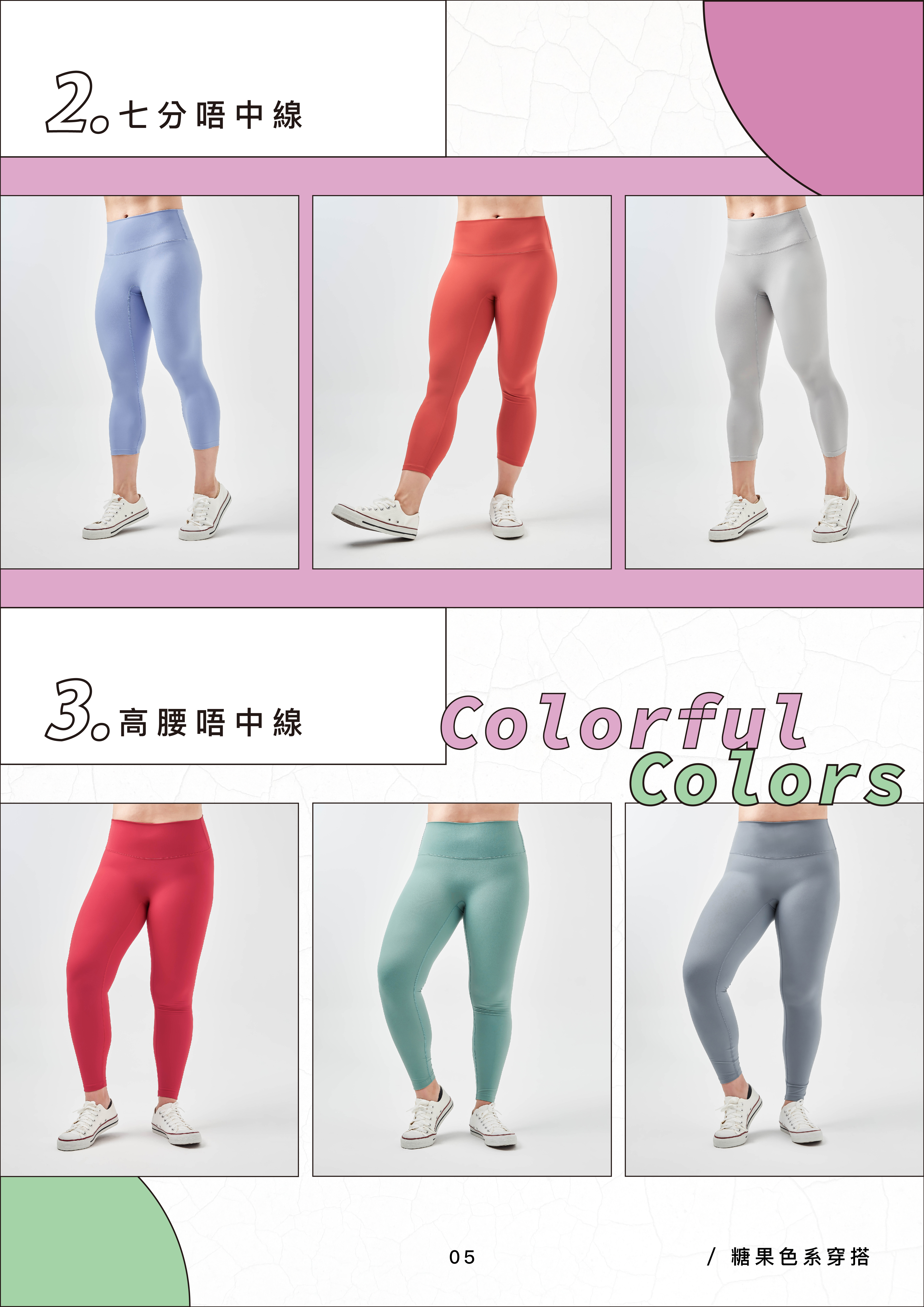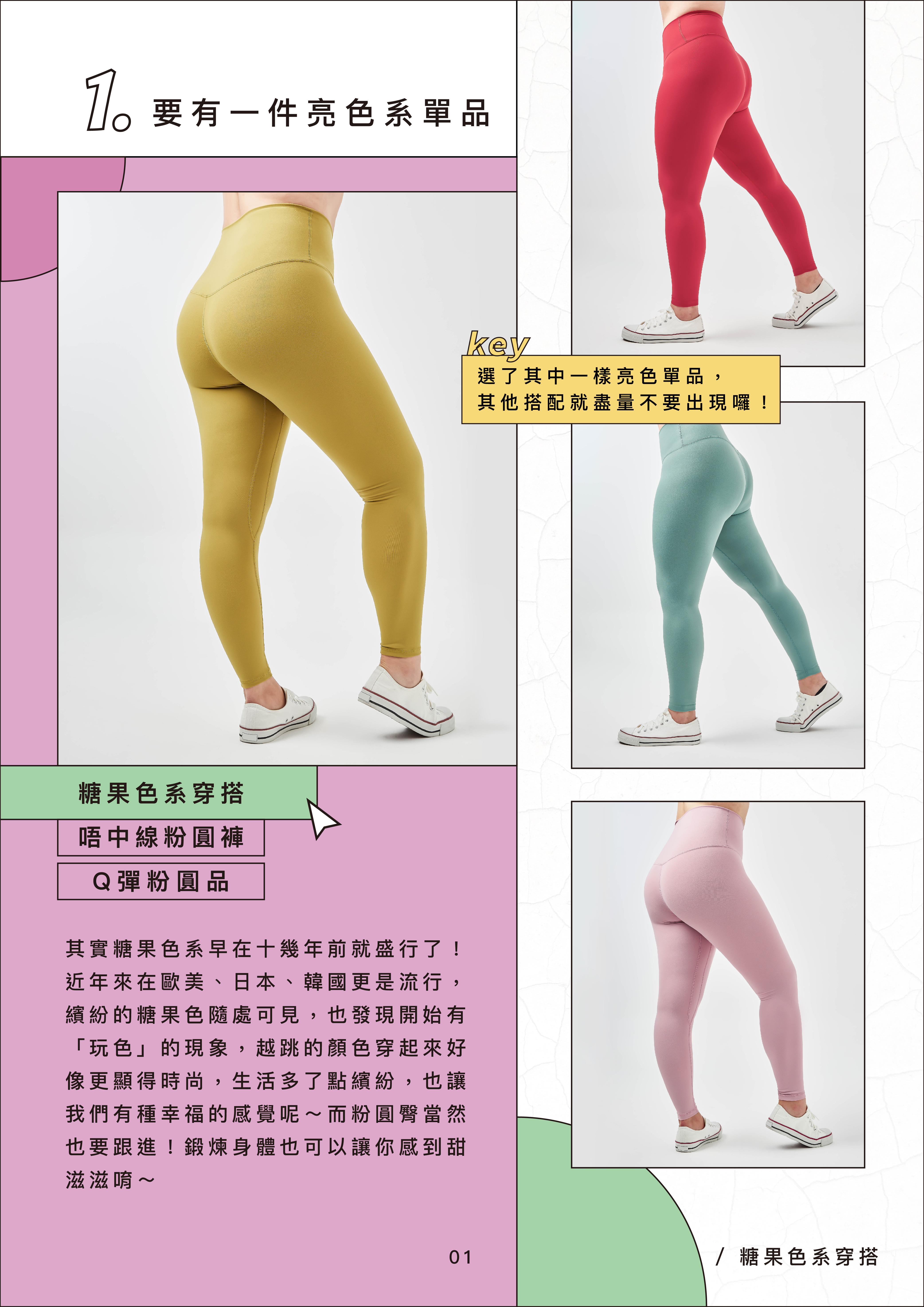 糖果色系早在十幾年前就盛行了,近年來在各國隨處可見,也開始有大膽「玩色」的現象,越跳的顏色穿起來更顯的時尚!而粉圓臀的馬卡龍色系大家不陌生吧~除了緊身褲,運動內衣也出好幾款讓你搭配,鍛鍊身體也可以讓你感到甜滋滋唷~