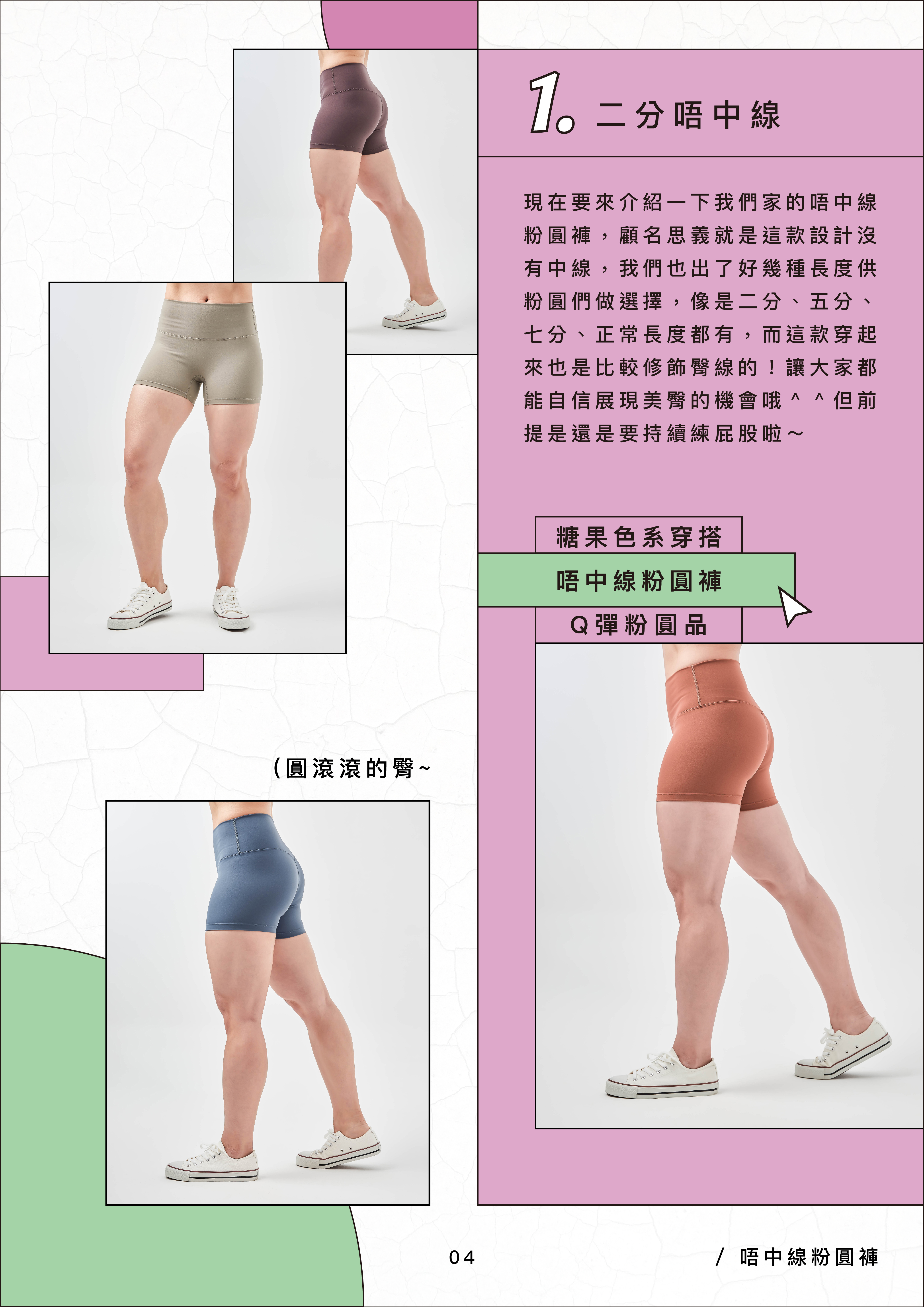 唔中線粉圓褲,顧名思義就是「沒有中線!」所以不用擔心女人最害怕的駱駝蹄,這款也有很多長度之分,像是二分褲、四分褲、五分褲、七分褲等,可以隨自己腳的長短、身形,選擇最適合你的長度,而我們今天介紹的這幾款是顏色比較亮一點的,更凸顯圓滾滾的臀~