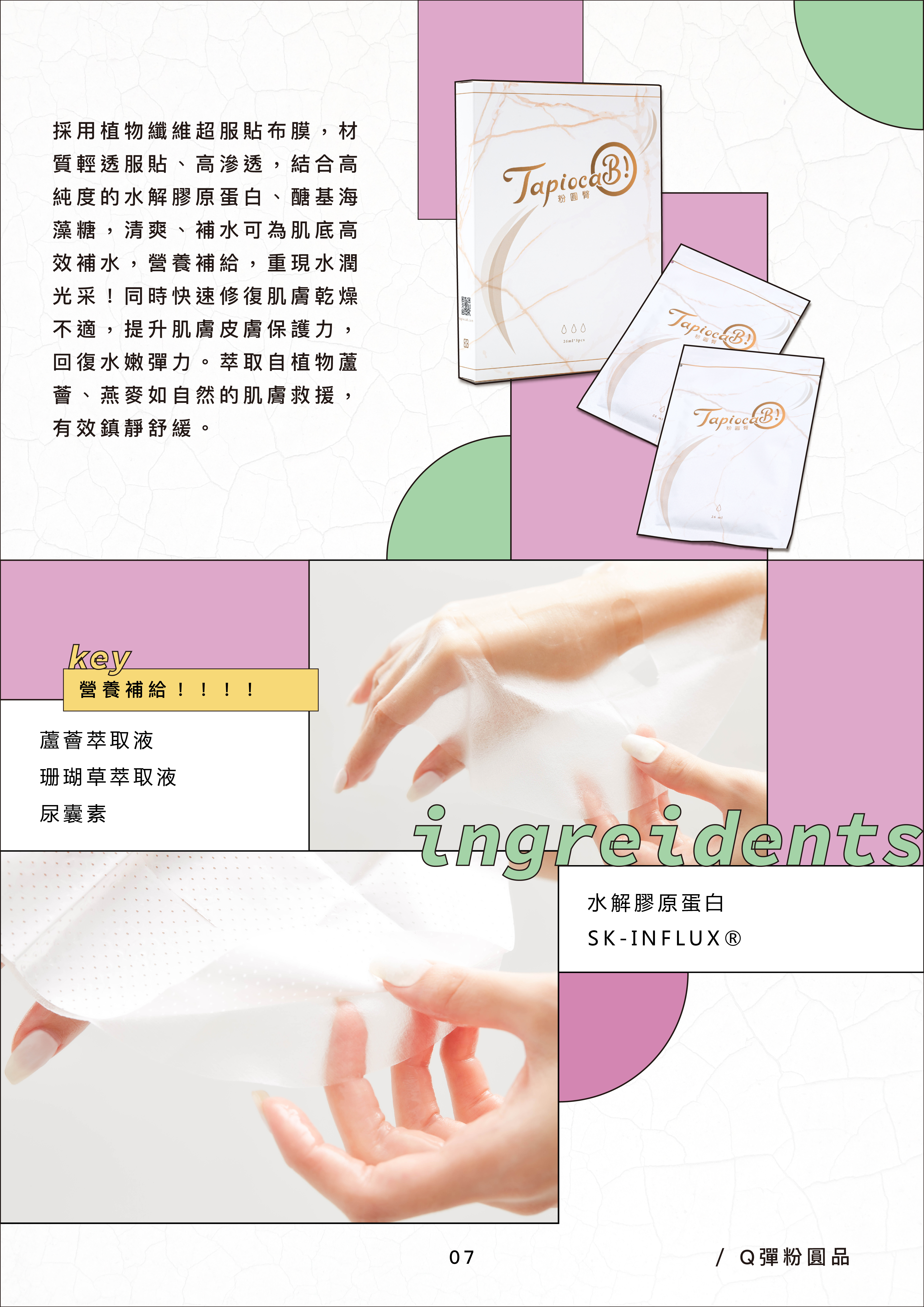成分是萃取蘆薈液、珊瑚草,富含許多維生素、礦物質,有舒緩鎮定皮膚敏感之處的作用,包含尿囊素、水解膠原蛋白、SK-INFLUX都是具有保水、去角質的功效,除了提升肌膚保護力,也達到營養補給的效果哦!