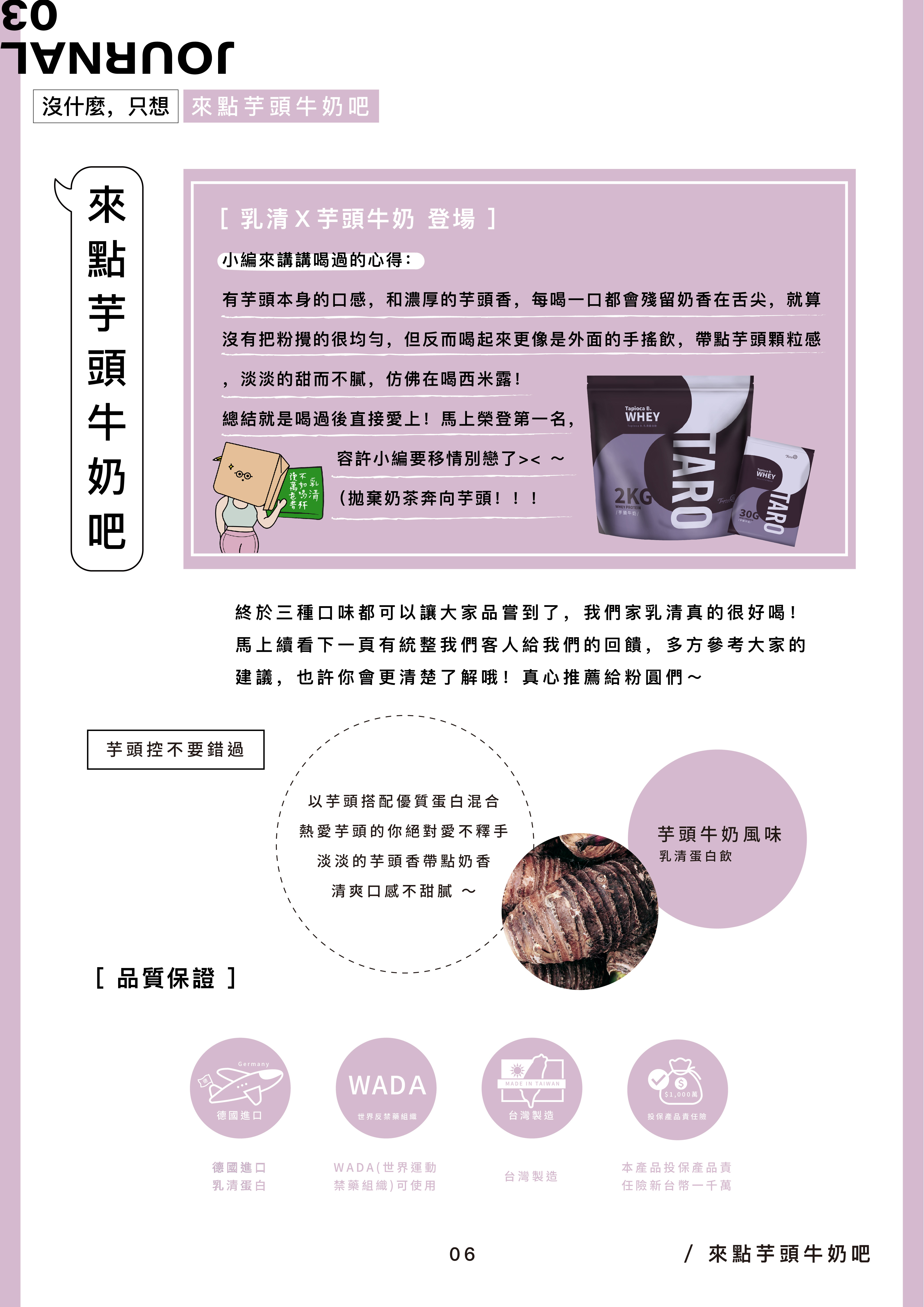 粉圓臀推出的《乳清蛋白飲》第三種口味也上市囉!最新款「芋頭牛奶」也是眾人喜愛的口味~我們乳清的五大特點「低糖、無代糖味、特調微糖、順口不卡喉、價錢親民」也有大小包裝,攜帶方便、想喝就喝!
