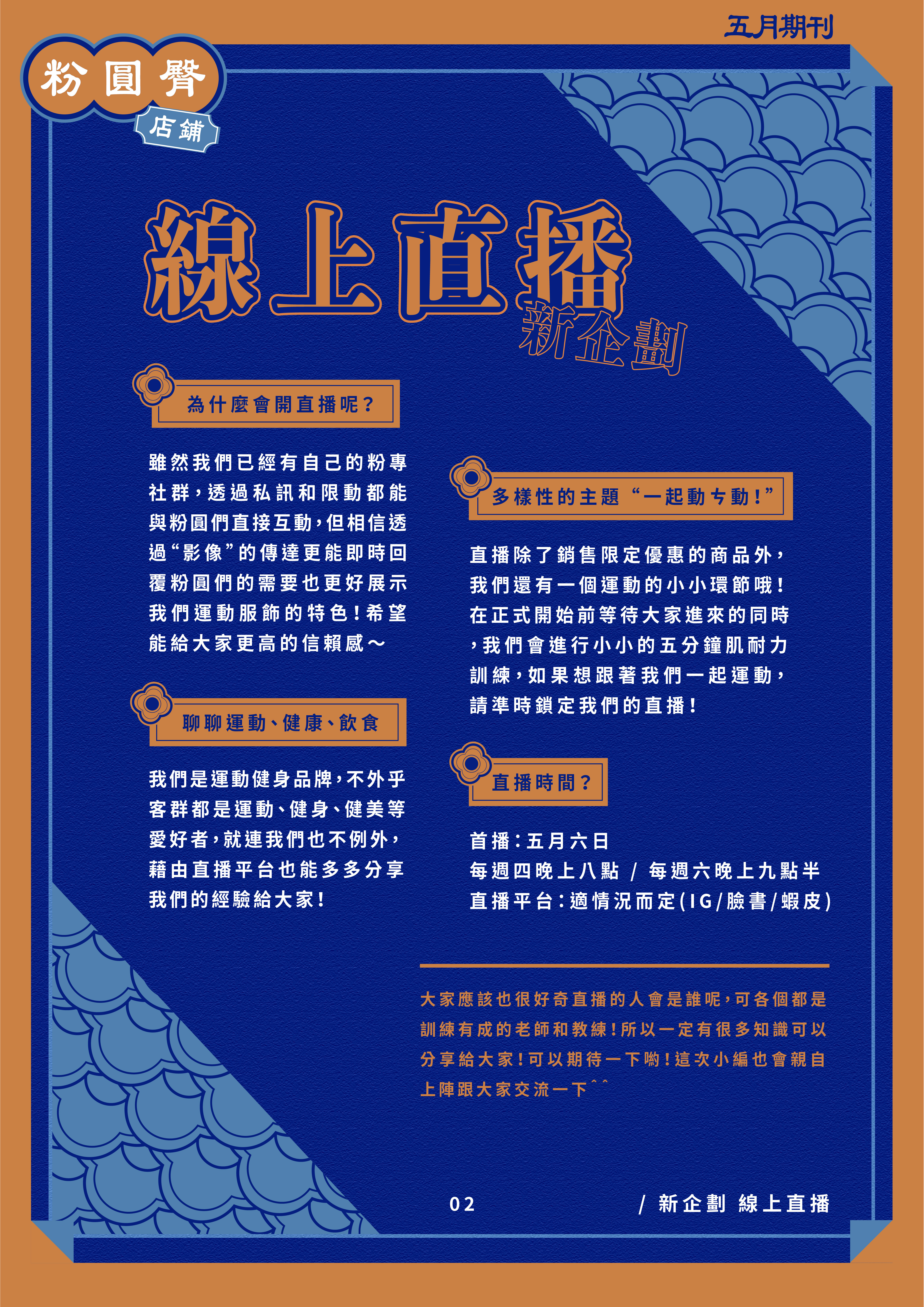 粉圓臀有個新企劃要帶給大家,除了銷售直播優惠商品外,我們還有個跟著粉圓臀「一起動ㄘ動」的環節,進行小小的肌耐力訓練!我們是運動健身品牌,不外乎客群們大多數是運動、健身、健美的愛好者,就連我們也不例外,藉由直播平台也能多多分享我們「運動、健康、飲食」的經驗給大家~