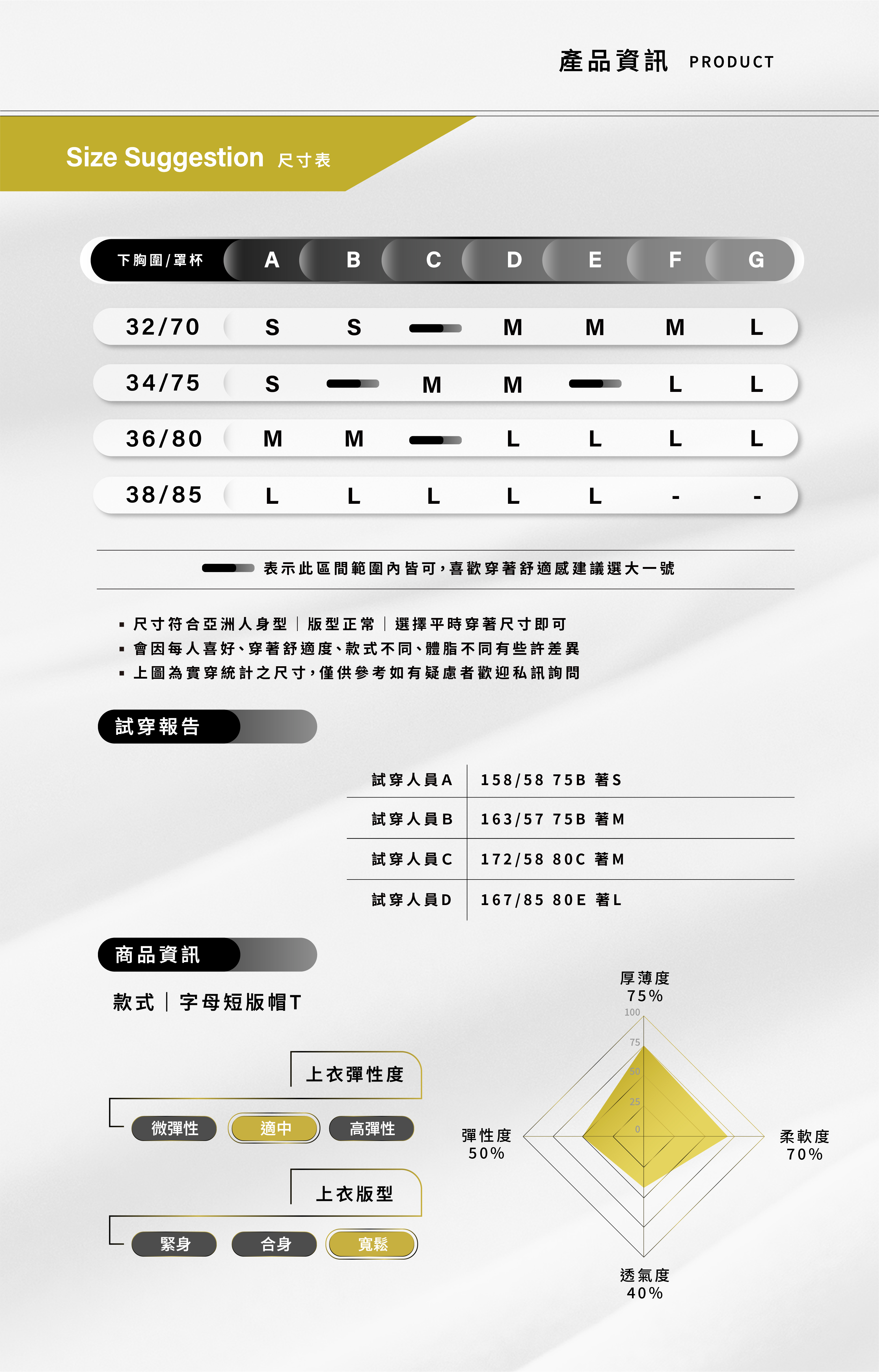 158cm / 58-60kg / 75B / 穿S號